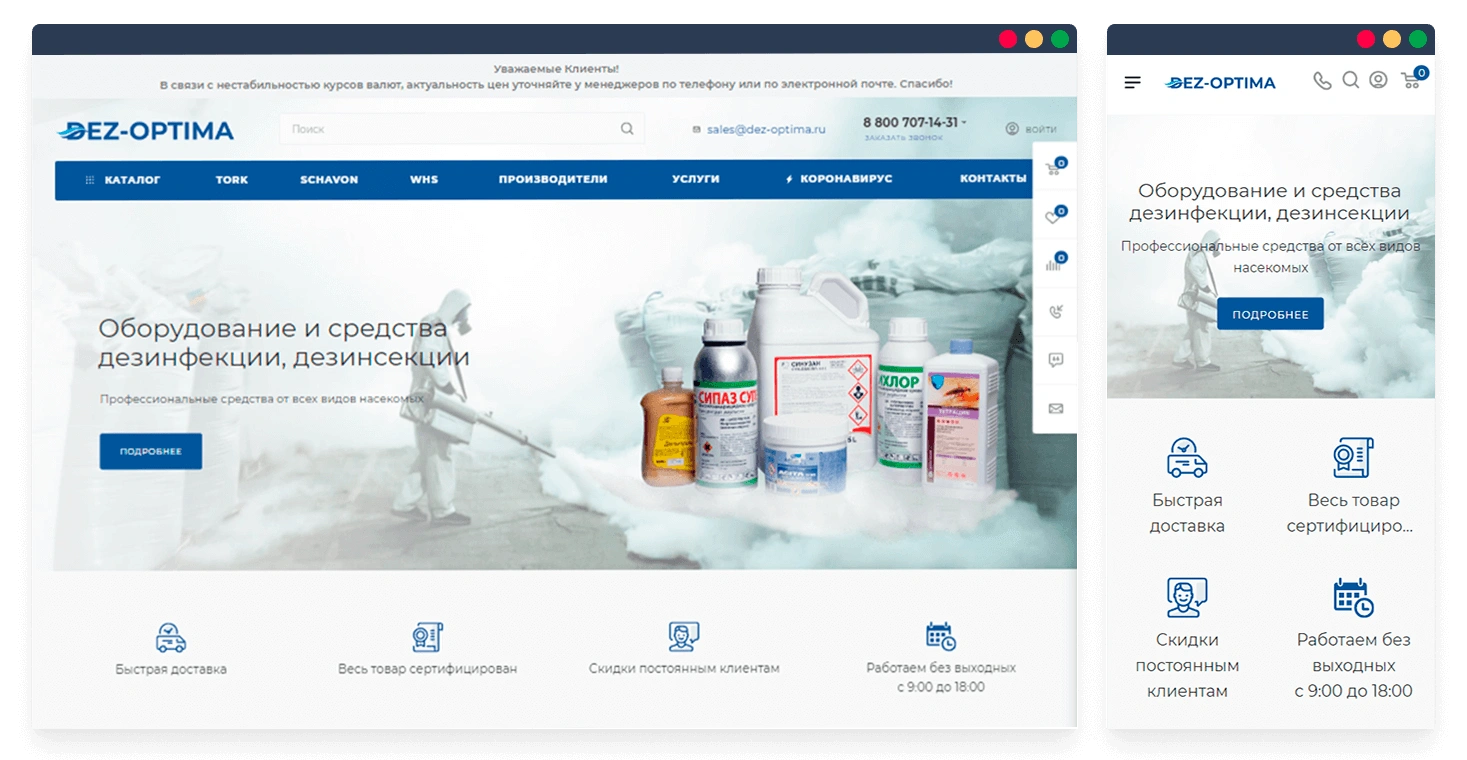 Компания Дез-Оптима занимается продажей оборудования и средств дезинфекции, предлагает широкий ассортимент гигиенической продукции, профессиональной химии и прочих товаров для торговых центров, гостиниц, производств и предприятий пищевой промышленности.