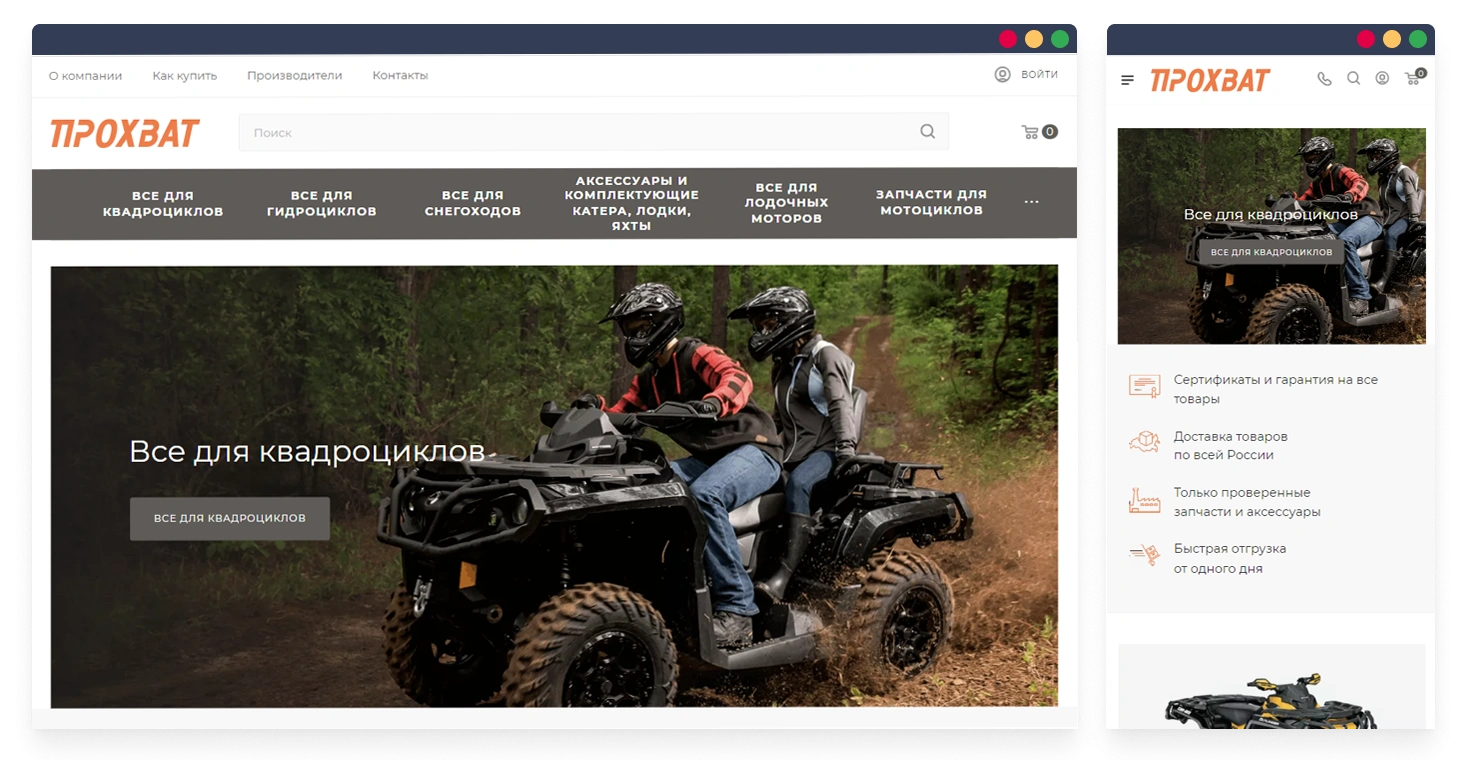 Интернет-магазин Прохват специализируется на продаже фирменных запчастей, масел и аксессуаров для квадроциклов, мотоциклов, снегоходов и прочей техники для активного отдыха. Компания сотрудничает с ведущими отечественными и зарубежными производителями Arctic Cat, BRP, Yamaha, Polaris, Kawasaki. Предлагает широкий ассортимент запчастей в наличии и осуществляет поставки под заказ, является официальным дилером продукции Voevoda.