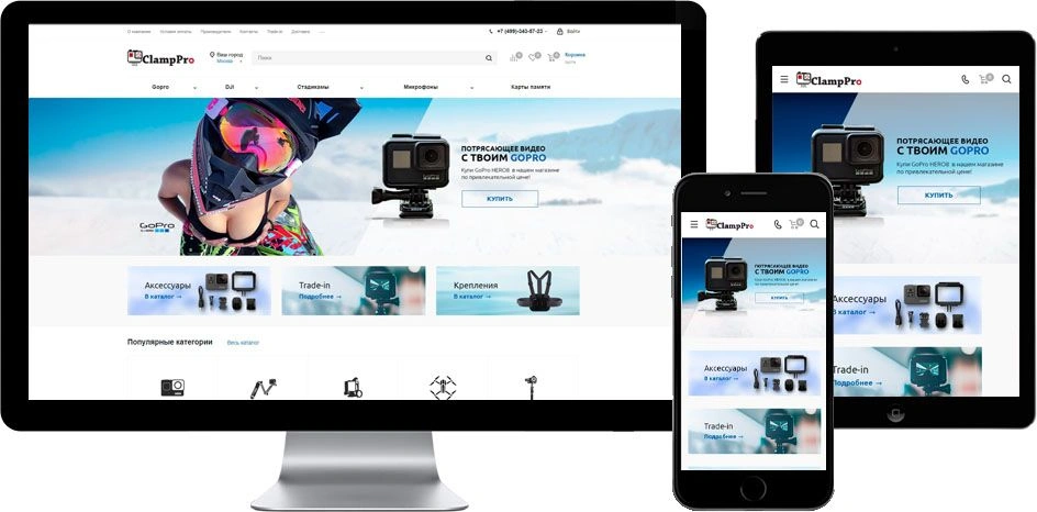 Интернет-магазин ClampPro предлагает широкий ассортимент камер GoPro и техники DJI, а также стедикамов, микрофонов и прочих аксессуаров для блогеров и экстремалов. Компания имела собственный сайт на OpenCart с ограниченным функционалом и слабыми показателями. Мы подобрали готовое решение Аспро и выполнили переезд на Битрикс. Подключили и настроили мультирегиональность на крупные города миллионники, всего 20 поддоменов. Автоматически наполнили сайт товарами с помощью парсинга cайтов конкурентов. Настроили Real-Time обмен с 1С. Настроили модули оплаты и доставки. Выполнили внутреннюю оптимизацию и работы по продвижению сайта. За полгода трафик посетителей из поиска увеличился в 15 раз.